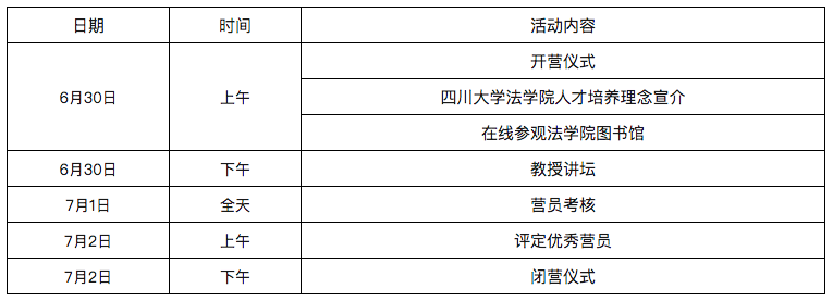 为了促进全国各高校法学学科优秀大学生的互动与交流,培养大学生从事科学研究的兴趣,并为优秀本科生提供了解我院学术科研环境和与专家、学者交流的机会,我院将于2020年6月30日至7月2日举办“2020年卓越法律人暑期云夏令营”。结合四川省疫情防控工作实际情况,夏令营采用网络远程方式进行。学院对拟推免或报考我校研究生的营员进行提前考核,考核优秀的营员,获得推免资格且满足学校接收推免生条件者,在推免系统填报我校即可免复试予以录取;未能获得推免资格但第一志愿报考我院的优秀营员(统考报考专业需与夏令营考核专业相同),同等条件下优先录取。现在面向全国高校招收营员200名,相关安排及注意事项公告如下: